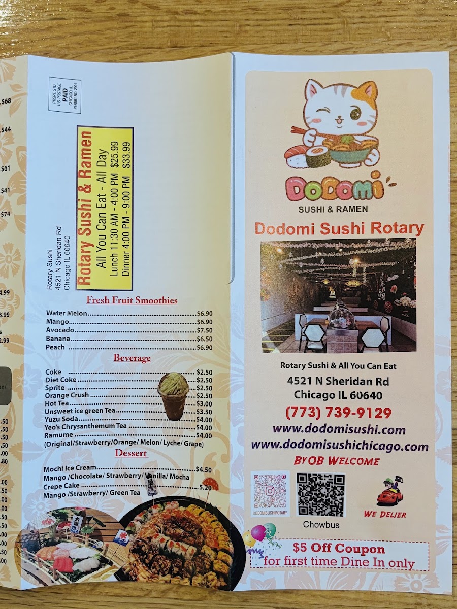Welcome to Dodomi Sushi Rotary, a delightful sushi haven located at 4521 N Sheridan Rd, Chicago. This charming eatery specializes in rotary sushi, offering an expansive menu that showcases freshness and creativity. Each dish is a visual treat, from their enticing Salmon Roll and Tuna Roll priced at just $4.99, to the more indulgent Spicy Crab Roll and Philly Roll at $7.50.